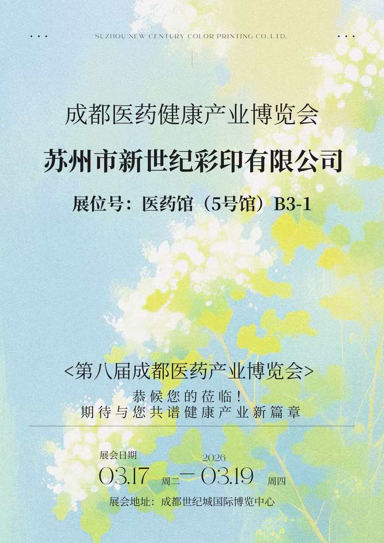 في الفترة من 17 إلى 19 مارس 2026، أقيم معرض تشنغدو الثامن للصناعة الطبية والصحية بشكل رائع في مركز تشنغدو سينشري سيتي الدولي للمؤتمرات والمعارض. كشفت شركة Suzhou New Century Color Printing Co., Ltd. (المشار إليها فيما يلي باسم "طباعة القرن الجديد") عن أحدث إنجازاتها في مجال تعبئة الأدوية في معرض كشك B3-1 في قاعة الأدوية (القاعة 5)، حيث تعرض بشكل شامل قوتها الشاملة في طباعة عبوات الأدوية والتصميم الهيكلي وخدمات الامتثال. لقد اجتذبت العديد من شركات الأدوية وخبراء الصناعة للتوقف وتبادل الأفكار.